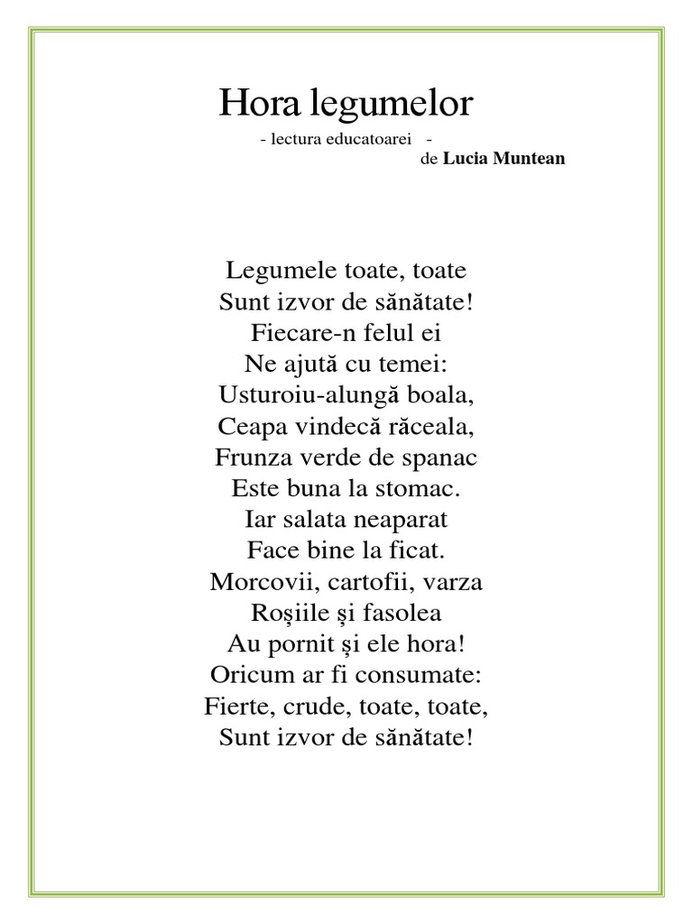 Biblioteca Publica Sinesti Posts Facebook Source from : https://www.facebook.com/Biblioteca-Publica-Sinesti-738370809610404/posts Legumele toate, toate sunt izvor de sanatate! Deşi unele legume sunt delicioase în stare crudă, în salate, atunci când sunt gătite eliberează nutrienţi ce pot fi asimilaţi mai eficient. Trabajamos duro para asegurarse de que el tiempo y la información que se presenta aquí en. Astazi vom invata poezia hora legumelor de lucia muntean. Erfahren sie mehr über die kontakte von lucia muntean und über jobs bei ähnlichen unternehmen.