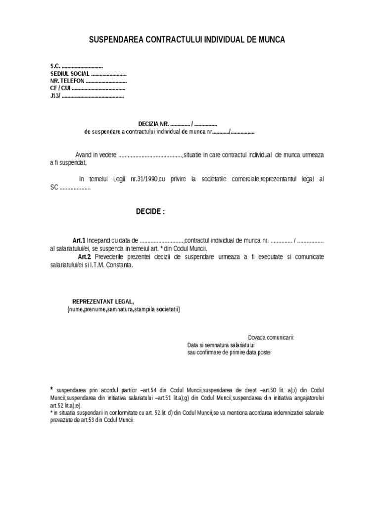 Perioada De Suspendare A Contractului Individual De MuncÄ MajoratÄ Jurnal Md Source from : https://www.jurnal.md/ro/economic/2017/10/5/perioada-de-suspendare-a-contractului-individual-de-munca-majorata/ Codul muncii consacra, în art.49, patru cazuri de suspendare a contractului individual de munca: Însă până să ajungi acolo trebuie să treci de etapa de recrutare, iar semnarea. (2) suspendarea contractului individual de munca are ca efect suspendarea prestarii muncii de catre salariat si a platii drepturilor de natura salariala de catre angajator. (2) contractul individual de munca poate fi suspendat in situatia absentelor nemotivate ale salariatului, in conditiile. • in cazul in care in vederea suspendarii contractului individual de munca, se va intocmi o decizie de suspendare cim pentru salariatul in cauza si se va inregistreza in revisal.
