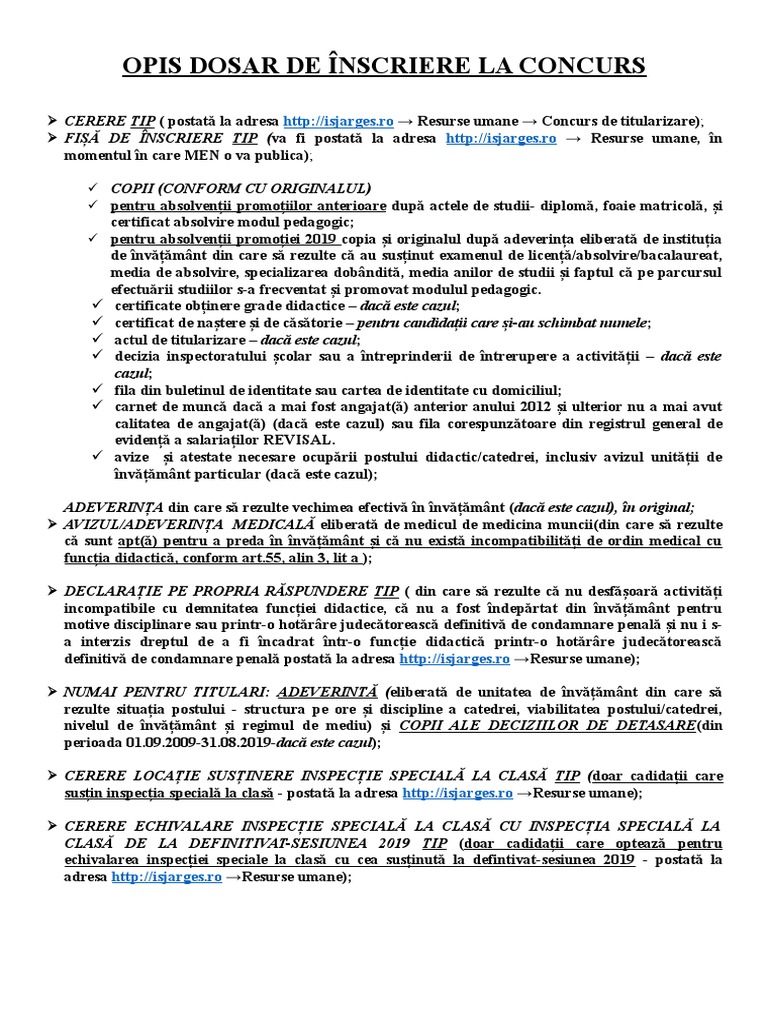 Titularizare 2019 Acte Necesare. 17.07.2019 · titularizare 2019 regulile de examen: Până la proba scrisă trebuie parcurse următoarele etape. Continuăm cu bătaia de joc titularizare 2019: Titularizare 2019 site ul oficial al ministerului cu posturile. Proba scrisă din cadrul concursului naţional de ocupare a posturilor didactice/catedrelor vacante/rezervate în dintre acestea, 3.091 de posturi didactice/catedre vacante sunt în mediul urban şi 1.228 în mediul rural.